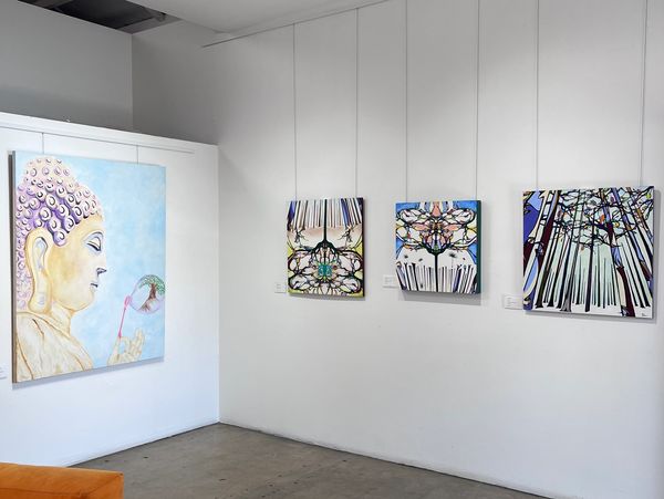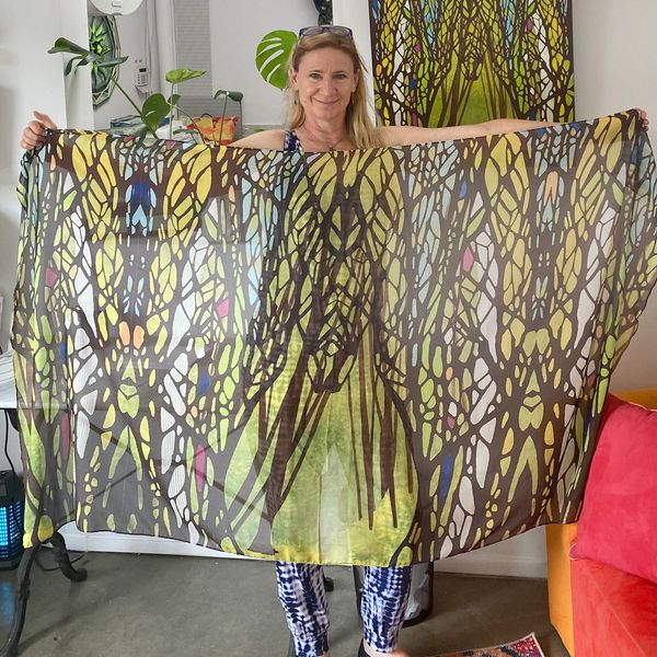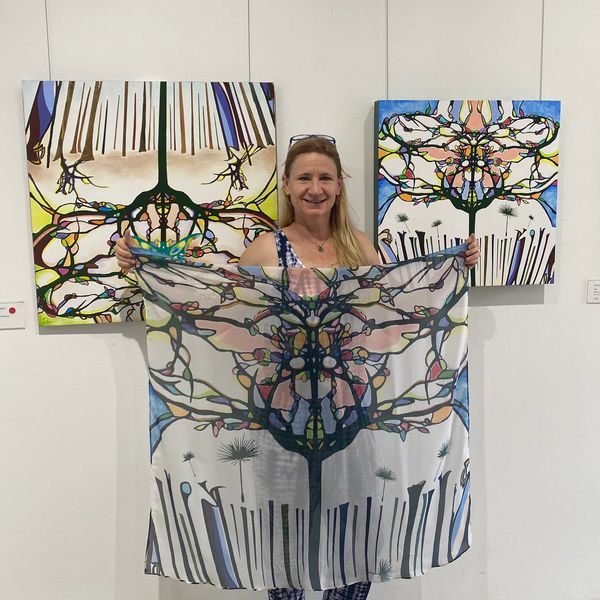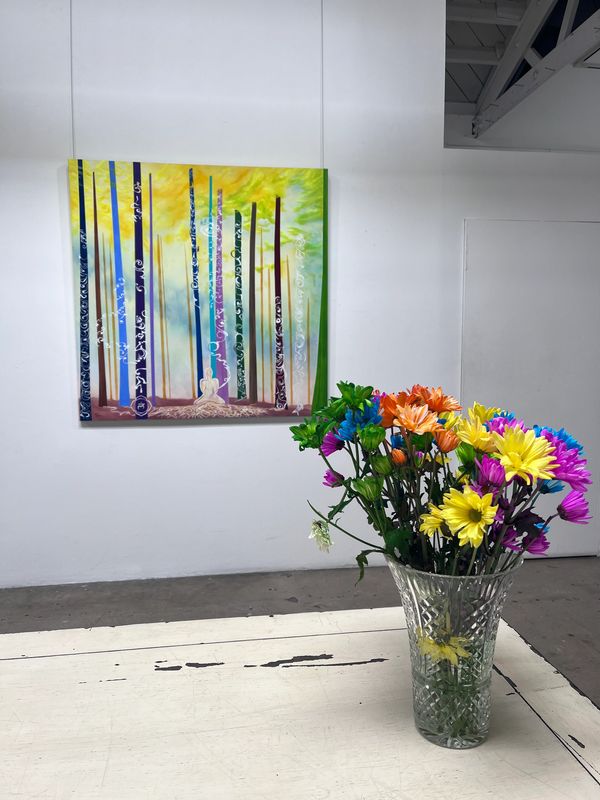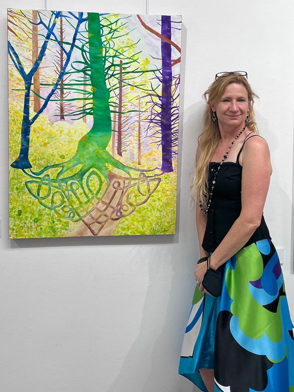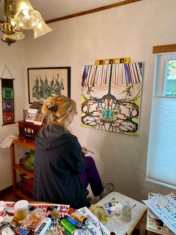 In my work, I usually start from photos I have taken in nature, work up composition sketches digitally, and execute the idea utilizing various mediums to create abstract fantasy environments enlivened with layers of glazing, inscribing, and attentive details. Playful themes of colorfully intertwined roots & branches or rowdy ocean waves often dance on my canvases. I experiment with contrasting an almost machine-like stained glass structure with lyrical feminine curves. Intricate lines, doses of symmetry, and peeks of light embody my expressions. Subject moods vary from quiet & contemplative to bold & exuberant.